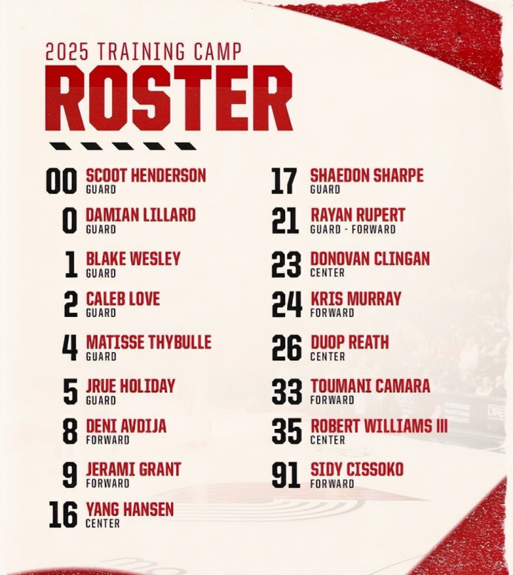 利拉德、霍勒迪、杨瀚森、亨德森、韦斯利、凯莱布-乐福、塞布尔、阿夫迪亚、杰拉米-格兰特、夏普、吕佩尔、克林根、克里斯-穆雷、里斯、卡马拉、罗威、西索科。